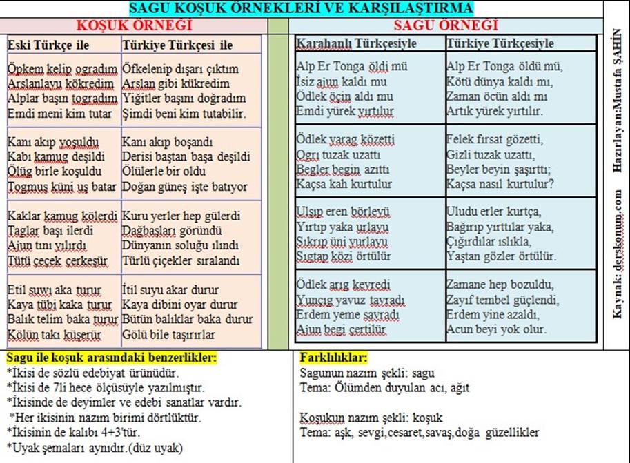 | Koşuk Türlüg çeçek yarıldı Barçın yadım kerildi Uçmak yeri körüldi Tumluk yana kelgüsüz | İlahi: Gönlüm düştü bu sevdaya Gel gör beni aşk n’eyledi Başımı verdim kavgaya Gel gör beni aşk n’eyledi | Türkü: Sarı saçlarına deli gönlümü Bağlamıştın, çözülmüyor Mihriban Ayrılıktan zor belleme ölümü Görmeyince sezilmiyor Mihriban | ||