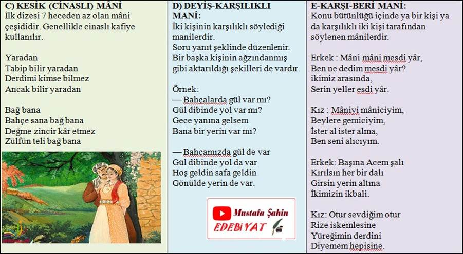 | 1- İslamiyet Öncesi Dönemdeki Türk şiiri 2- Geçiş Dönemi Edebiyatı / Eserleri ( 11-12.yy Türk Edebiyatı) 3- Halk Edebiyatı Şiiri(Tekke-Tasavvuf – Dini Halk Şiiri, Anonim Halk Şiiri, Aşık Tarzı Halk Şiiri,) 4- Divan Edebiyatı Şiiri |